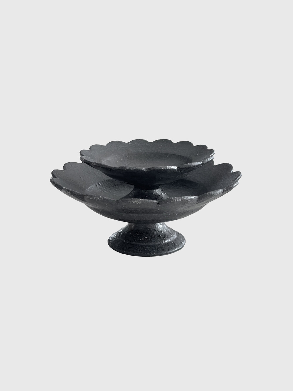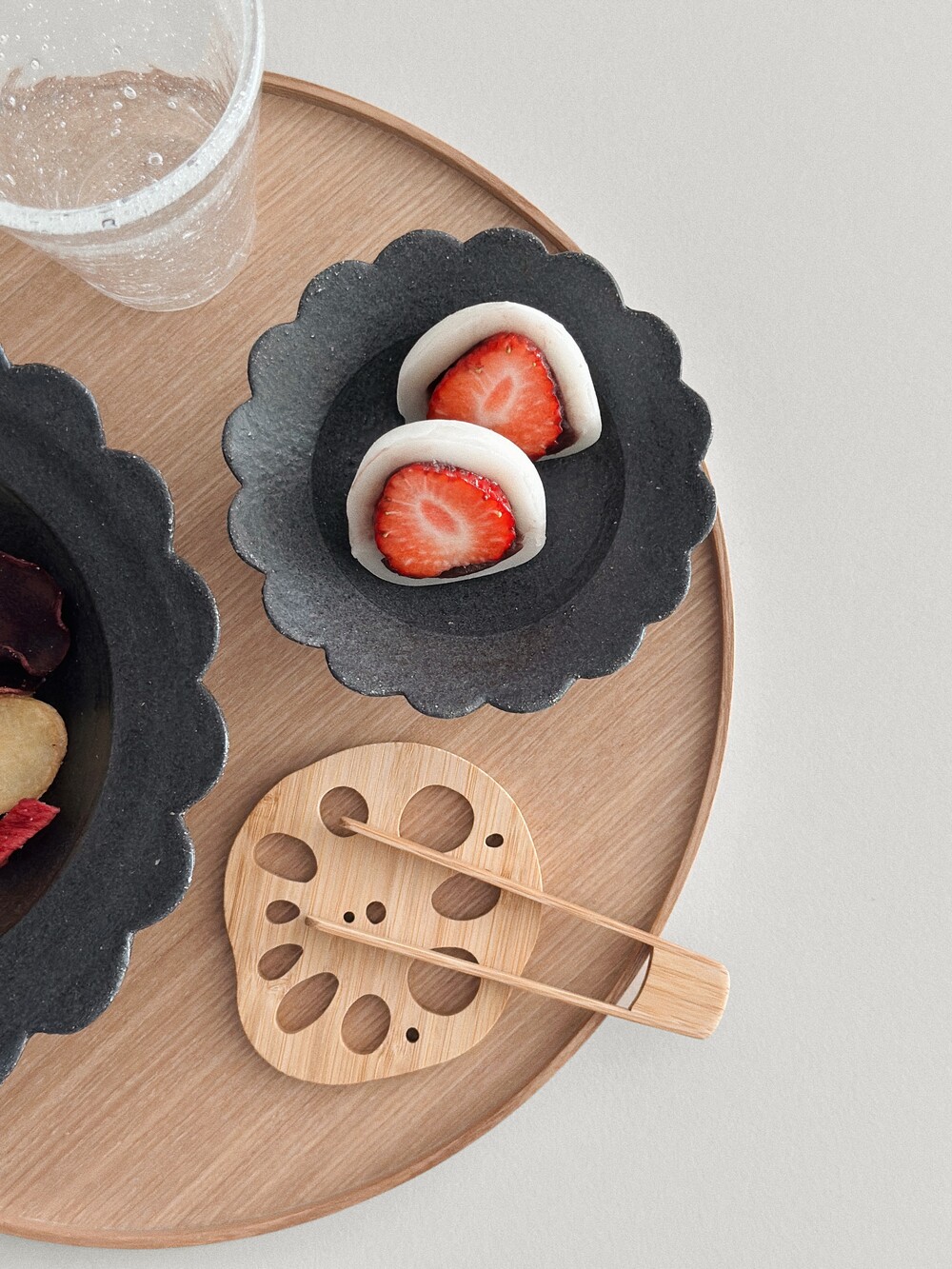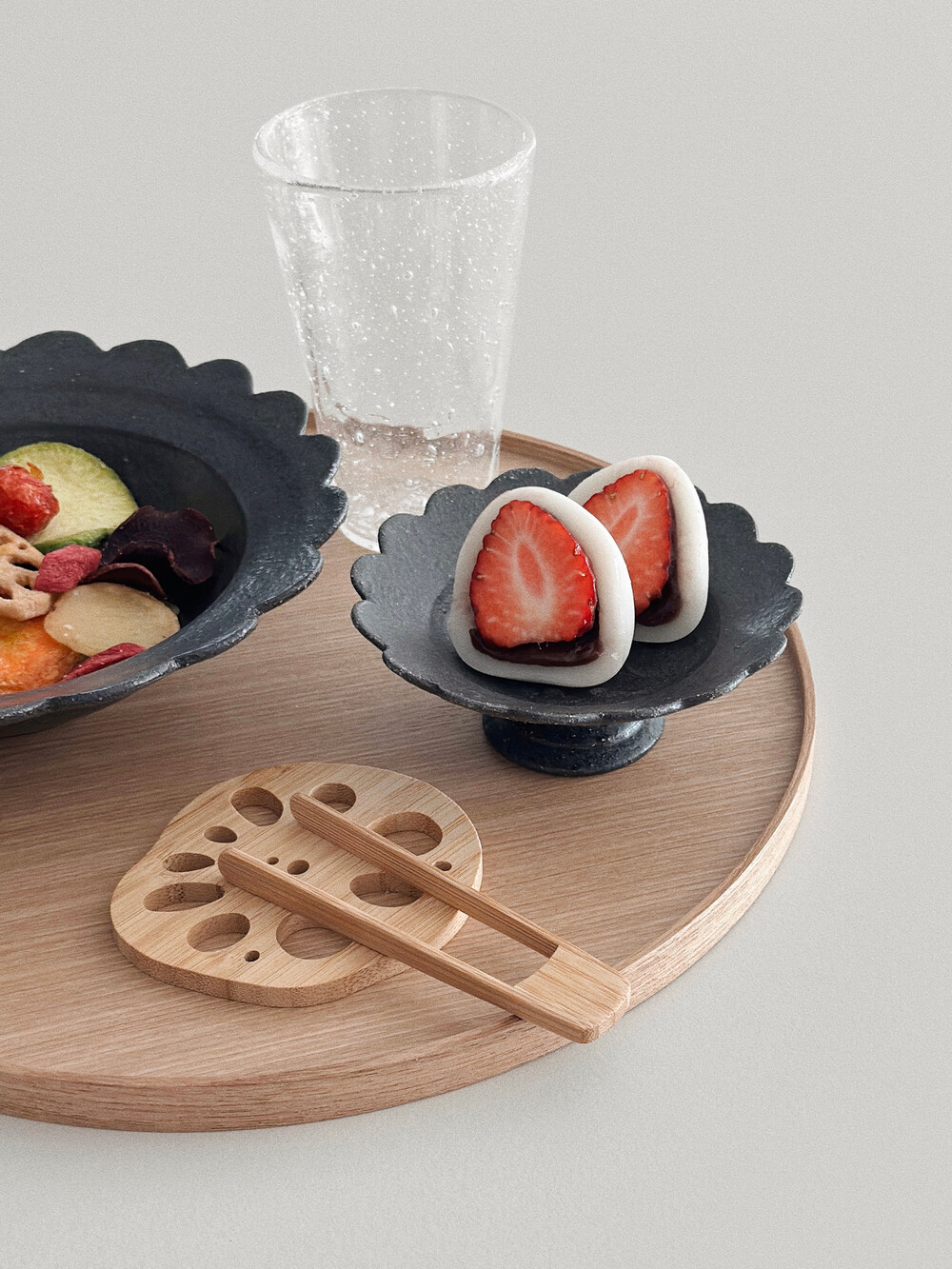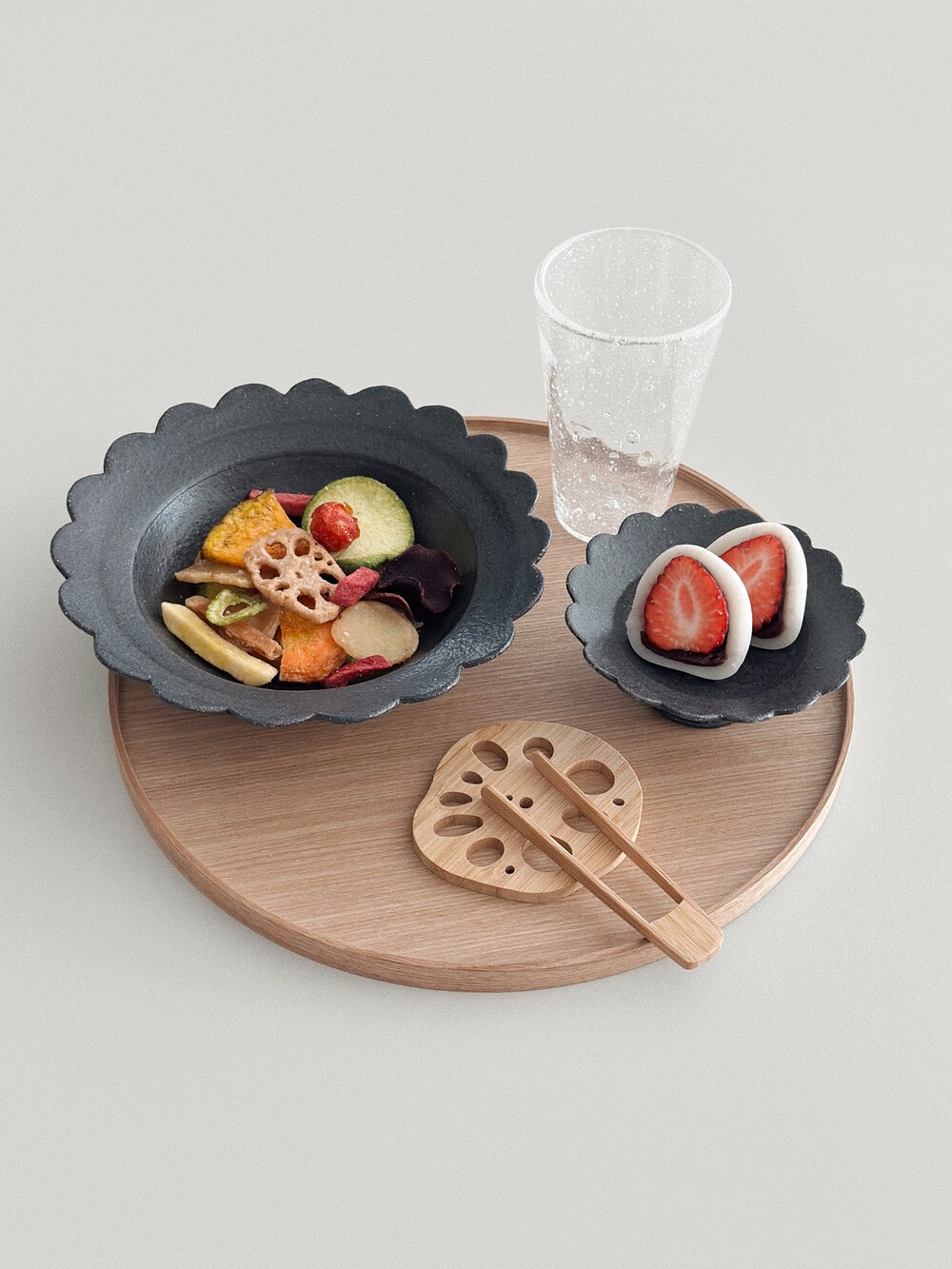 거친 흑토 베이스에 독특한 유면처리로 고동빛, 회색빛의 오묘한 검정색이 담겨져 음식을 돋보여주고 고급스러운 플레이팅을 제공해줍니다.