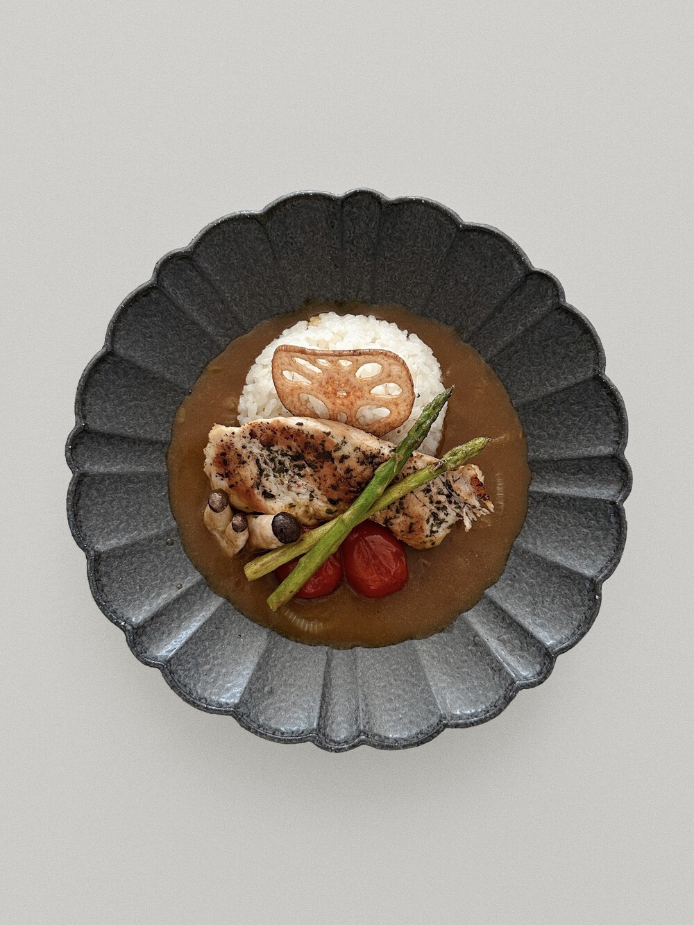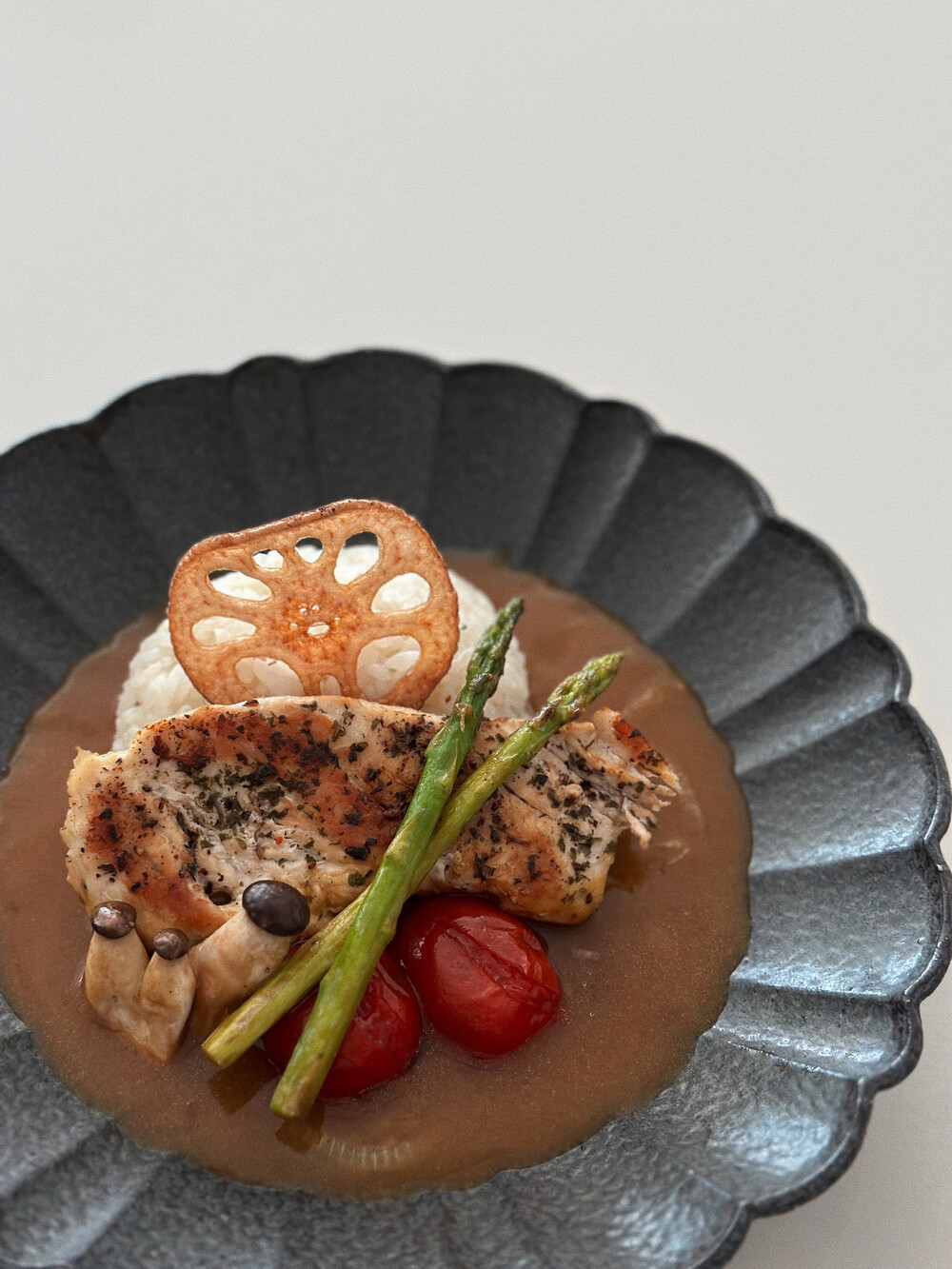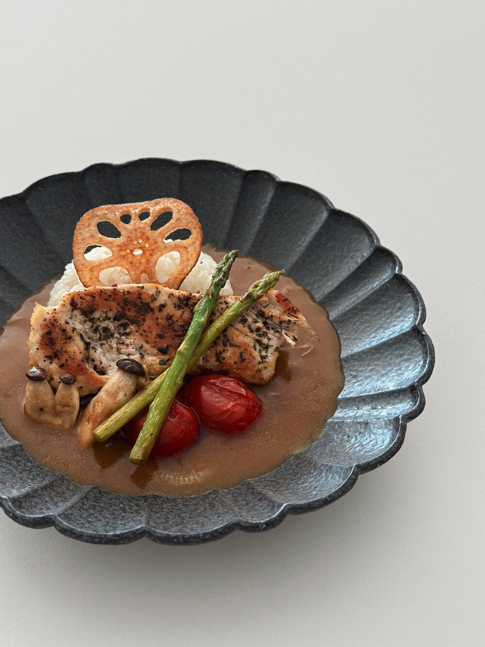 거친 흑토 베이스에 독특한 유면처리로 고동빛, 회색빛의 오묘한 검정색이 담겨져 음식을 돋보여주고 고급스러운 플레이팅을 제공해줍니다.