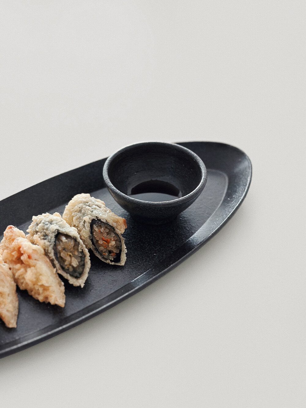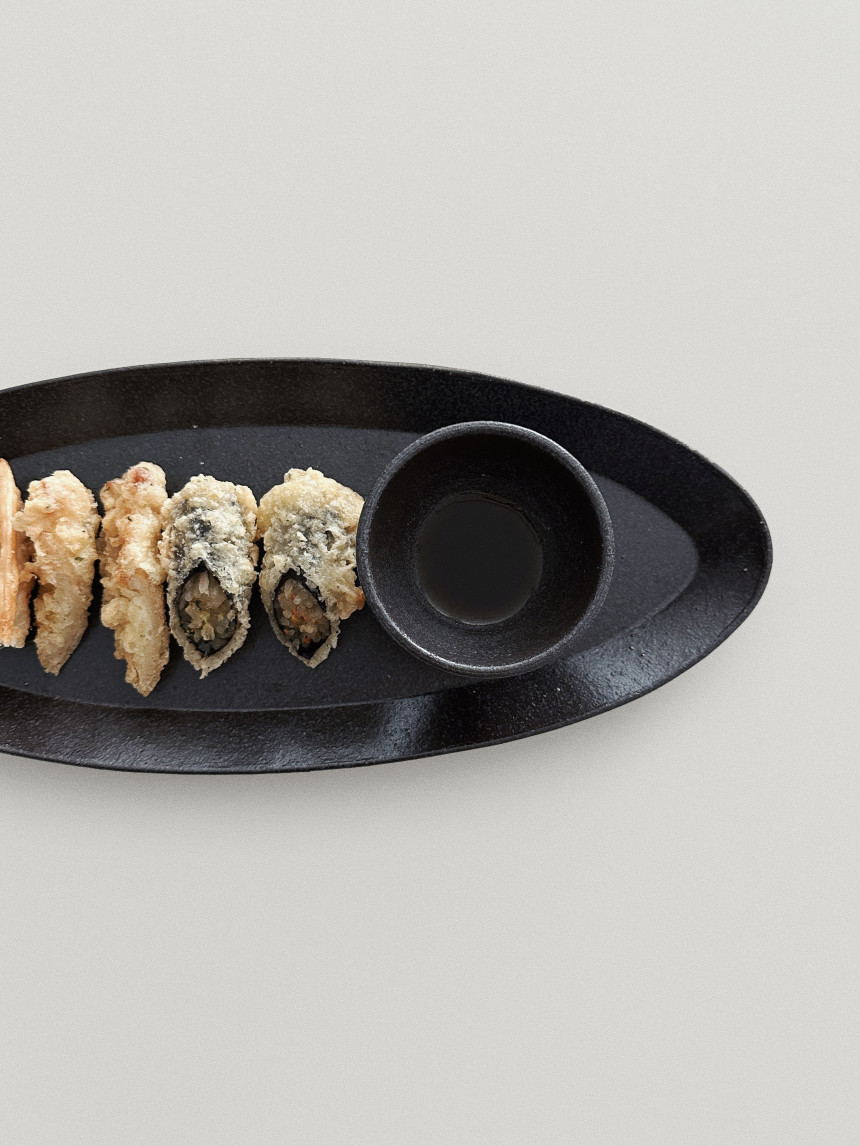 거친 흑토 베이스에 독특한 유면처리로 고동빛, 회색빛의 오묘한 검정색이 담겨져 음식을 돋보여주고 고급스러운 플레이팅을 제공해줍니다.
