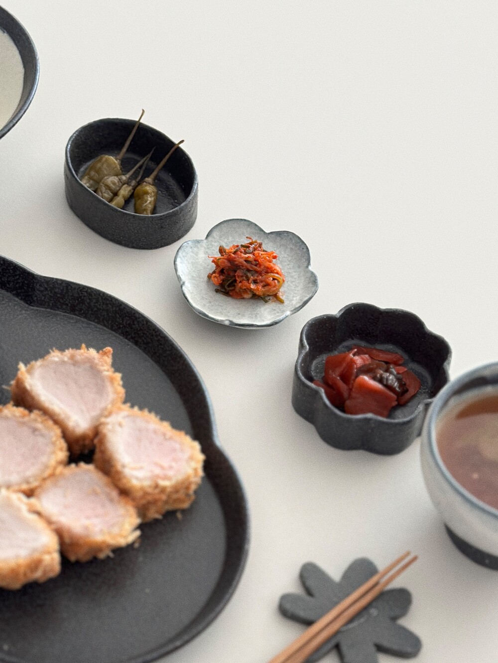 거친 흑토 베이스에 독특한 유면처리로 고동빛, 회색빛의 오묘한 검정색이 담겨져 음식을 돋보여주고 고급스러운 플레이팅을 제공해줍니다.