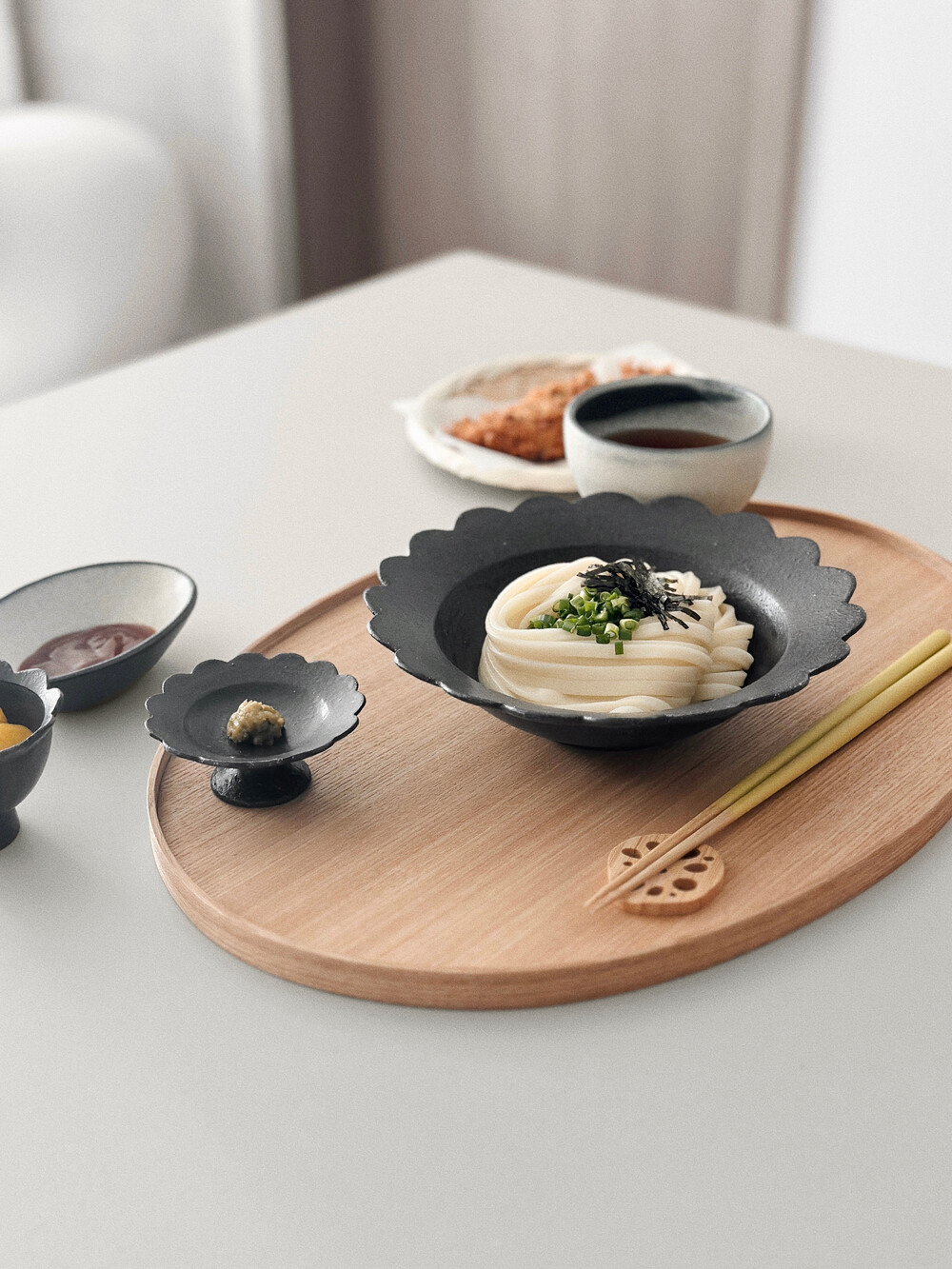 거친 흑토 베이스에 독특한 유면처리로 고동빛, 회색빛의 오묘한 검정색이 담겨져 음식을 돋보여주고 고급스러운 플레이팅을 제공해줍니다.