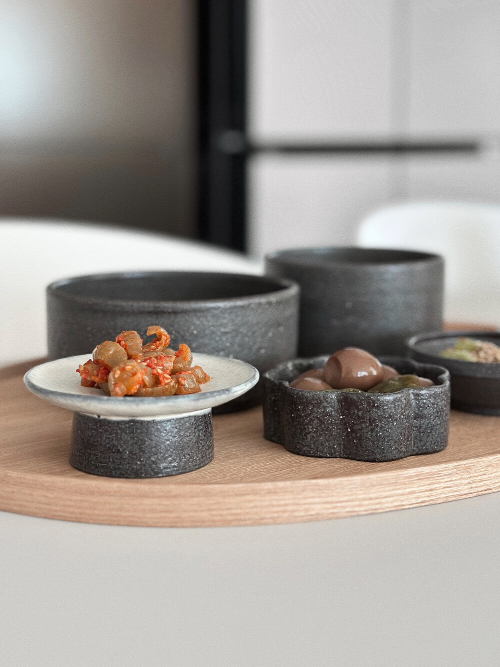 거친 흑토 베이스에 독특한 유면처리로 고동빛, 회색빛의 오묘한 검정색이 담겨져 음식을 돋보여주고 고급스러운 플레이팅을 제공해줍니다.